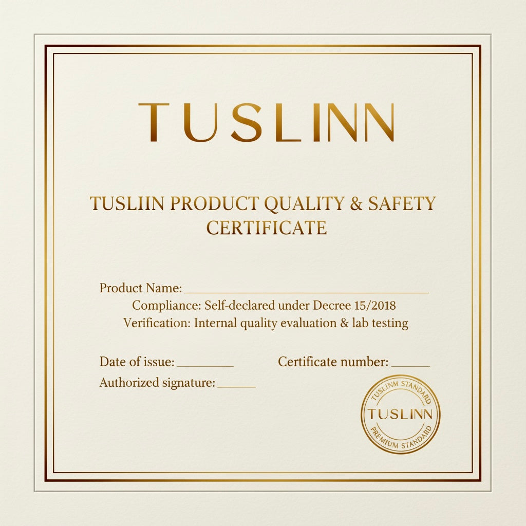 Sản phẩm của TUSLINN được sản xuất và lưu hành theo đúng quy định pháp luật hiện hành về An toàn thực phẩm.Từng lô sản phẩm đều có Phiếu kiểm nghiệm (COA), Hồ sơ tự công bố theo Nghị định 15/2018/NĐ-CP, và được Cơ quan chuyên trách về ATTP/Sở Y tế xác nhận tiếp nhận trước khi đưa ra thị trường.Chúng tôi cam kết minh bạch – tuân thủ pháp lý – và đảm bảo an toàn tuyệt đối cho người sử dụng.Chất lượng không chỉ là cam kết, mà là nghĩa vụ pháp lý TUSLINN luôn thực hiện một cách nghiêm túc.